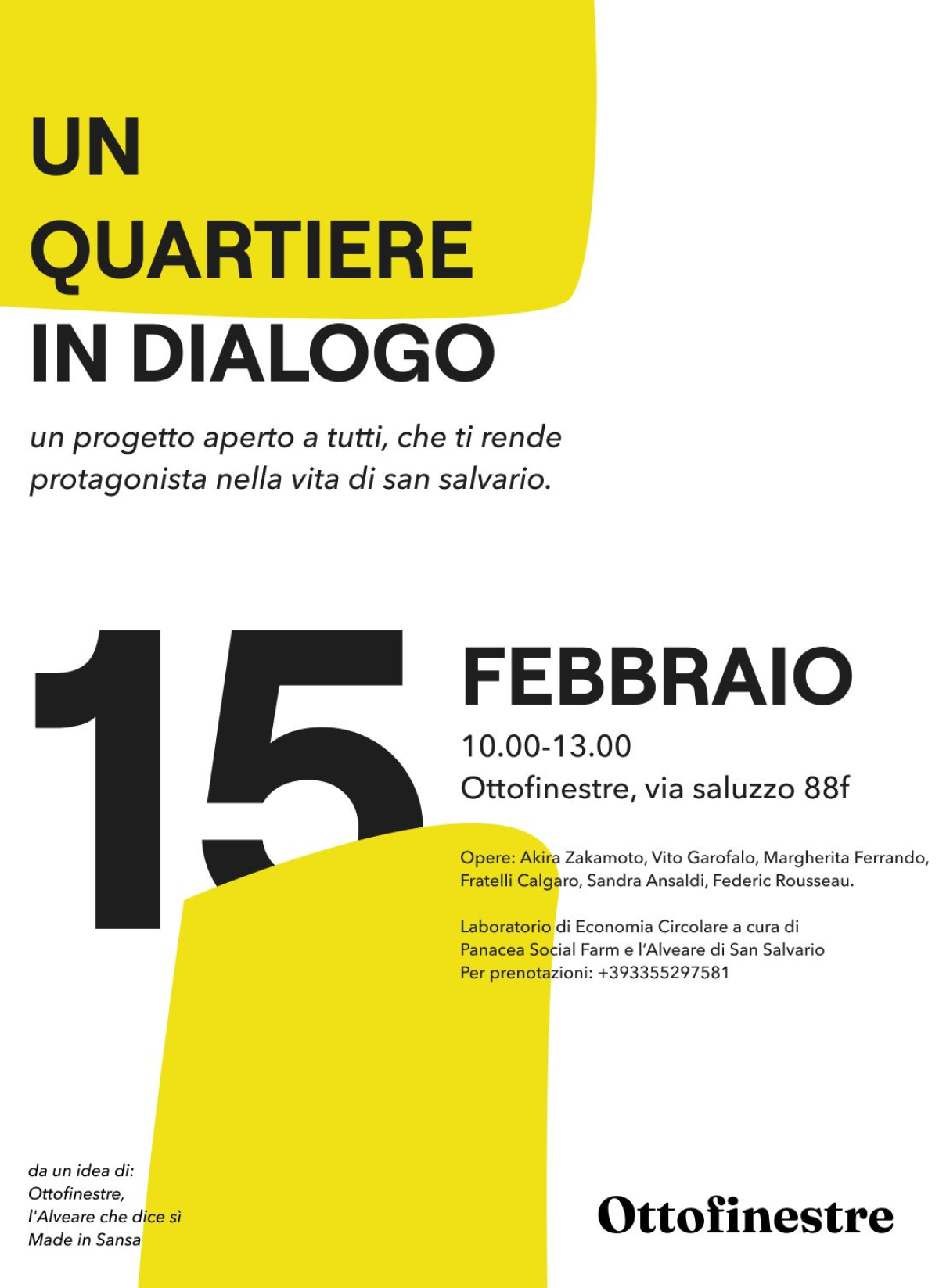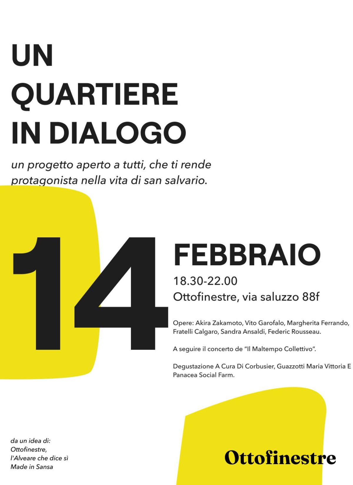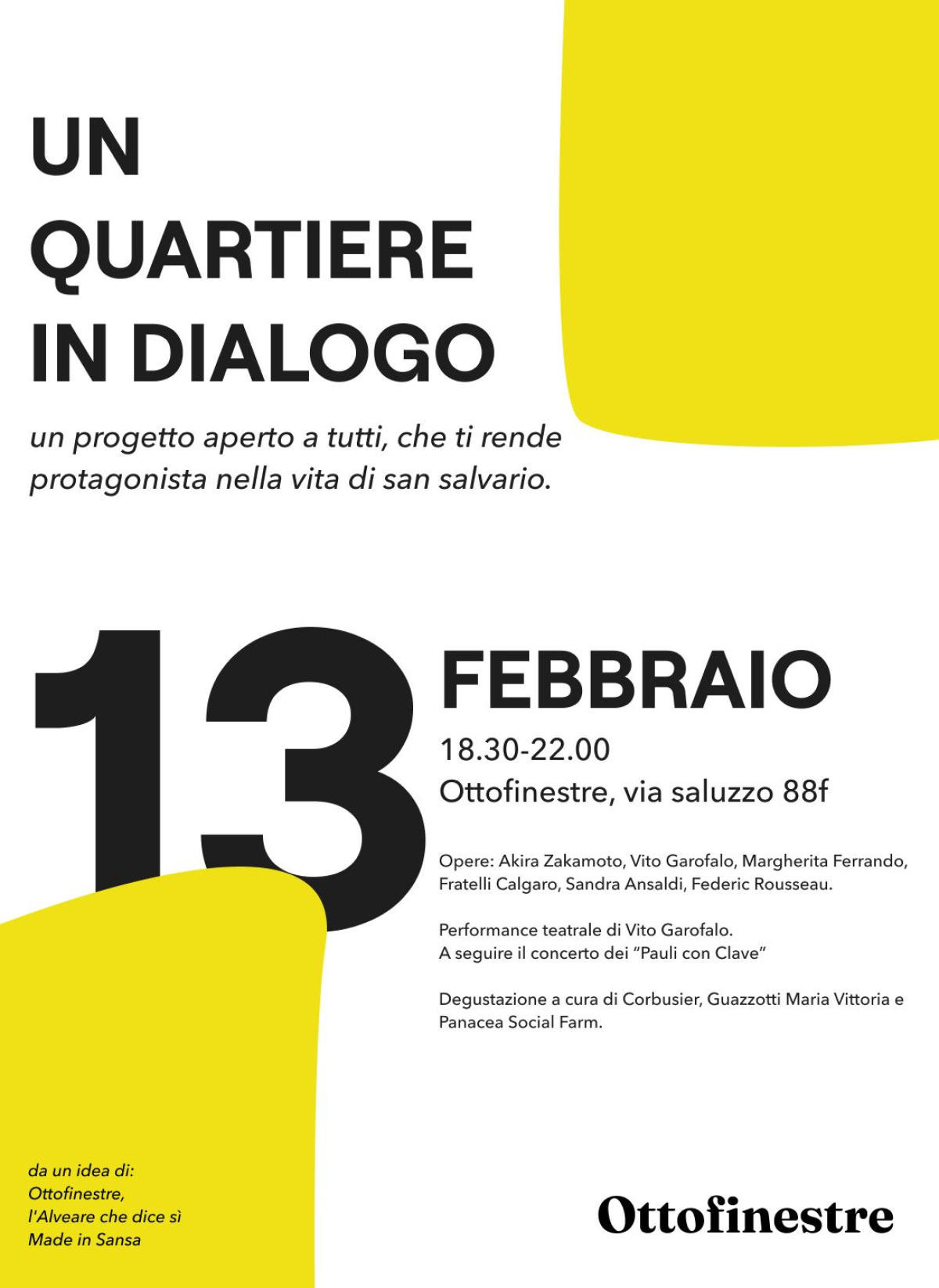 L’evento si svilupperà il giovedì 13 e venerdì 14 febbraio, all’interno degli spazi di Ottofinestre, in via Saluzzo 88F Torino, dalle ore 18.30 alle ore 22, dove sarà possibile il dialogo e la visione di una selezione delle opere dei pittori Akira Zakamoto, Vito Garofalo, la pittrice Margherita Ferrando, il fotografo Fratelli Calgaro dello Studio Santa Veronica, gli artisti Sandra Ansaldi e Federic Rousseau. Oltre ai quadri, ci sarà una performance teatrale di Vito Garofalo e il concerto dei musicisti “Pauli con Clave” (Paul Christian, Livio Taricco, Luca Cavaliere, Sofia Ferraro, Eugenio Enria) il giorno giovedì 13. Il venerdì 14 suoneranno i musicisti del “Maltempo collettivo”. Sempre presenti in sala gli artisti sopra citati. In entrambe le giornate si potranno incontrare e assaggiare i prodotti caseari e vinicoli dell’azienda agricola Corbusier, l’azienda vinicola Guazzotti Maria Vittoria e le produzioni da forno di Panacea Social Farm.